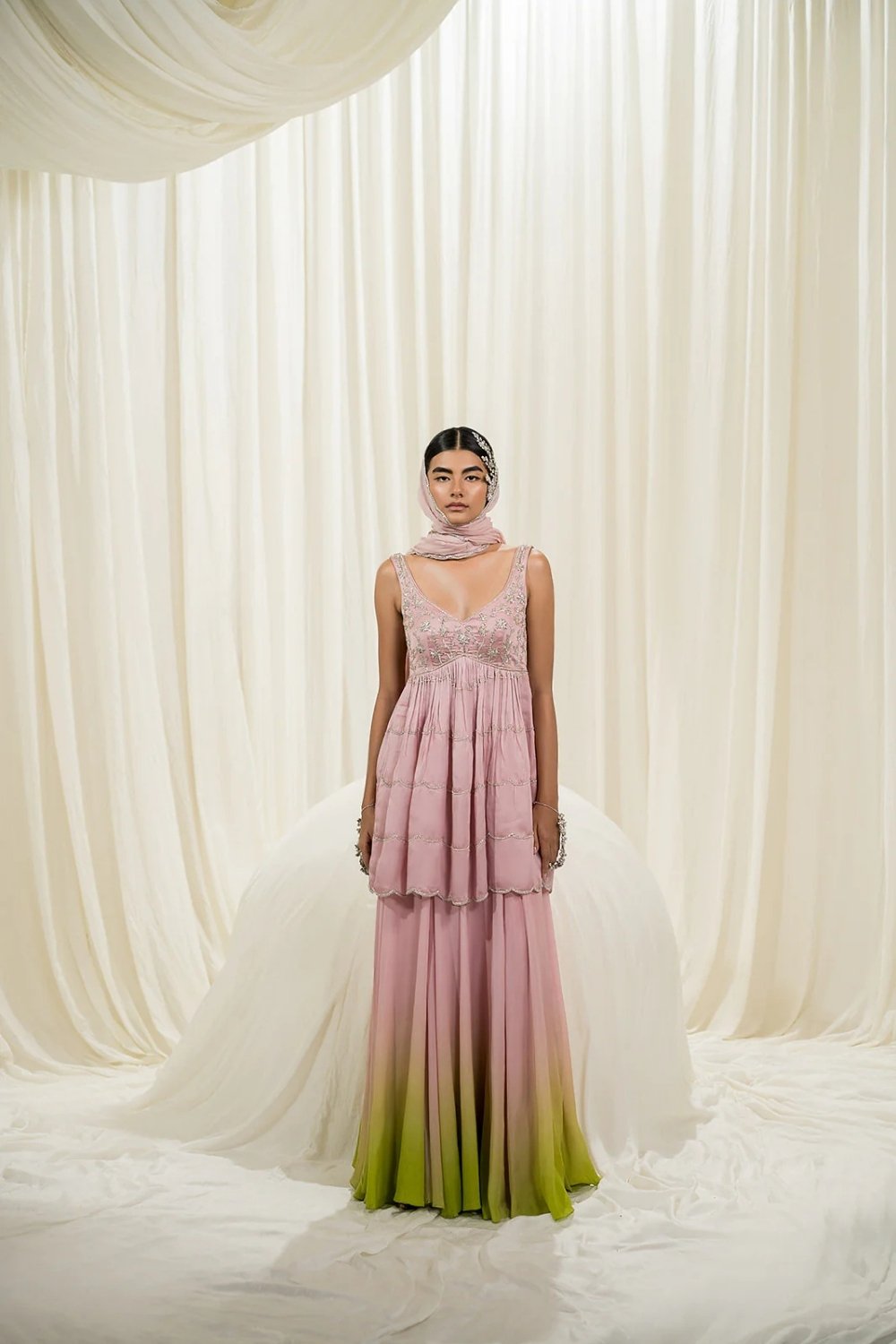 The baby pink peplum has a beautiful silver embroidery in the yoke and scallop embroidery in the ghera with a scallop hem for a detailed look. The two-shaded sharara and scallop embroidered dupatta with butti work provide a unique style to this set.