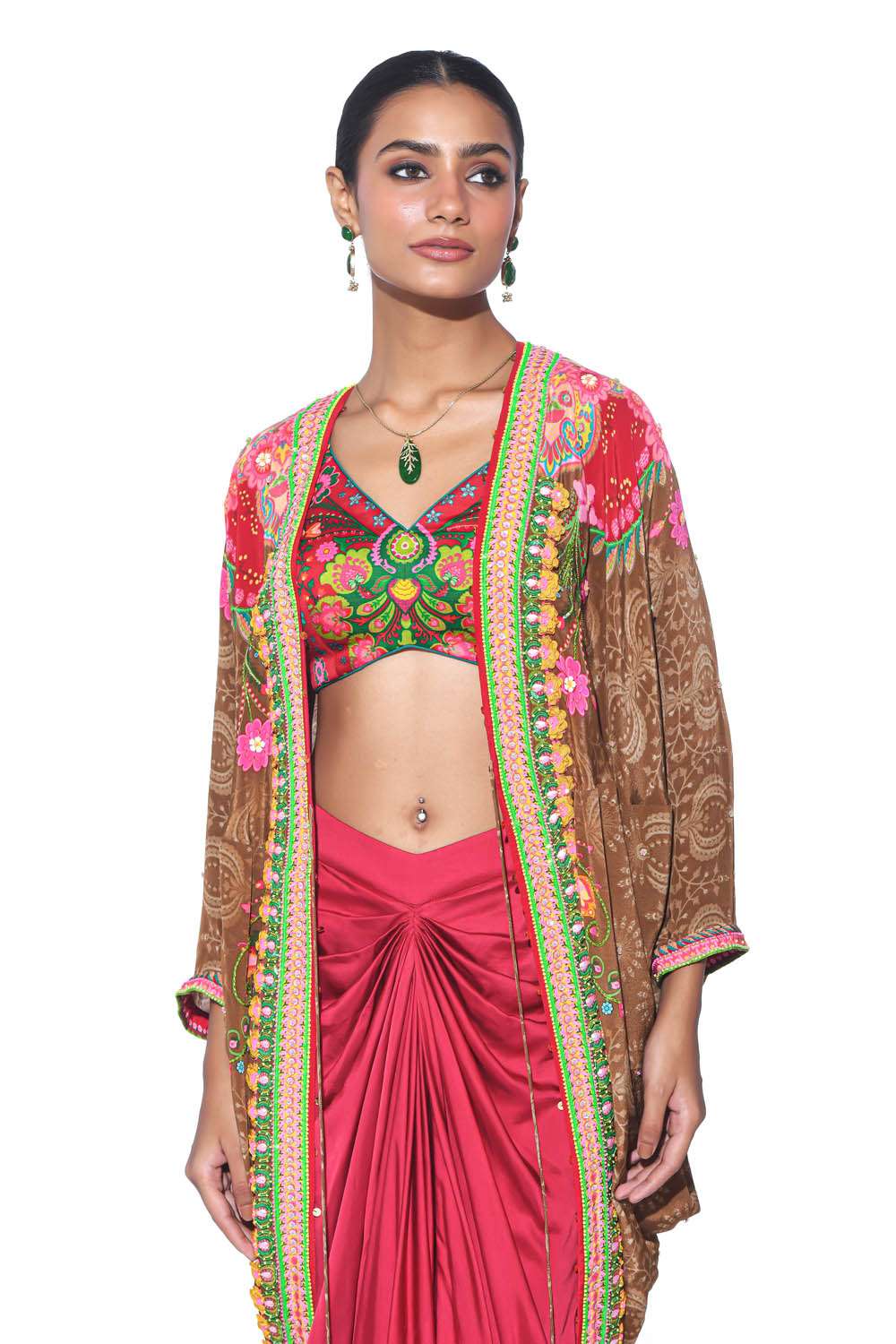 Earthy Brown And Red Border With Sb Signature 3D Hand Embroidered Shrug, Crimson Cranberry Red Printed Sleeveless Blouse, Velvet Dream Red Drape Skirt.