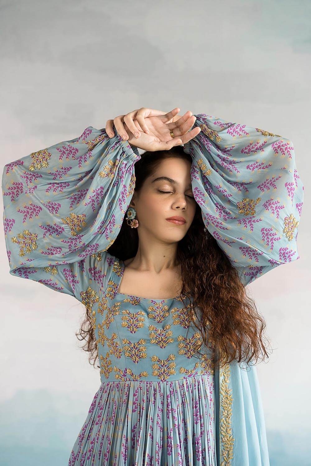 The Powder Blue printed anarkali comes with statement sleeves handcrafted in beautiful golden nakshi and border embroidered dupatta.