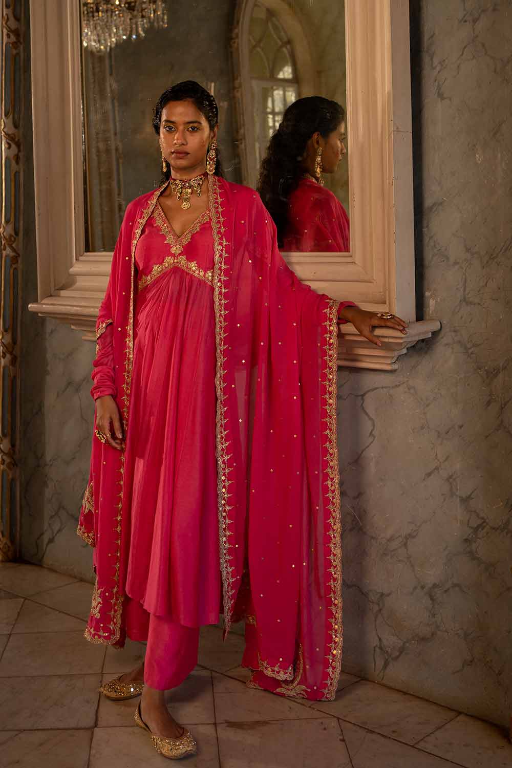 Featuring a pink cotton silk anarkali set paired with an organza base dupatta with antique gold dori and embellished with sequin hand–embroidery.