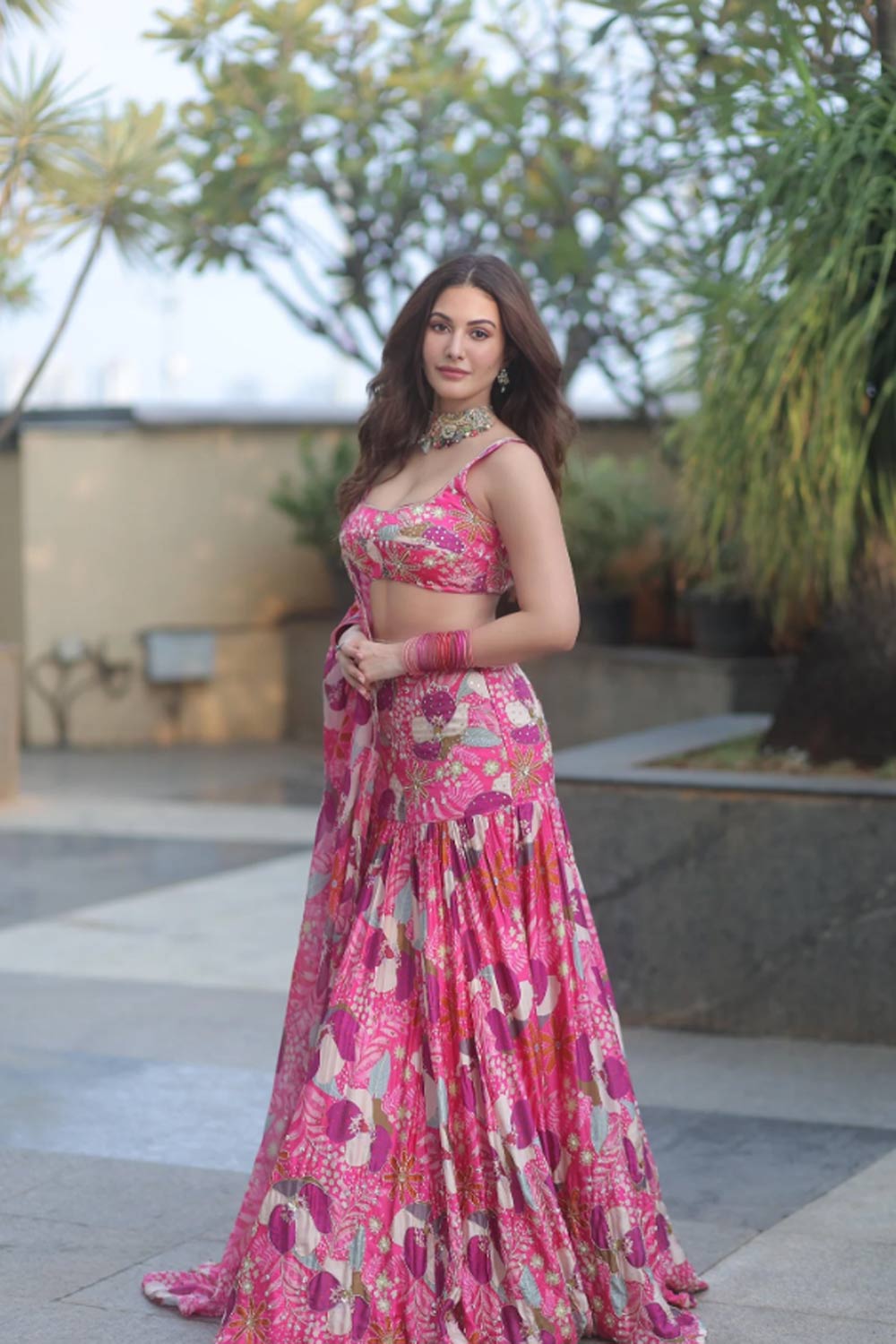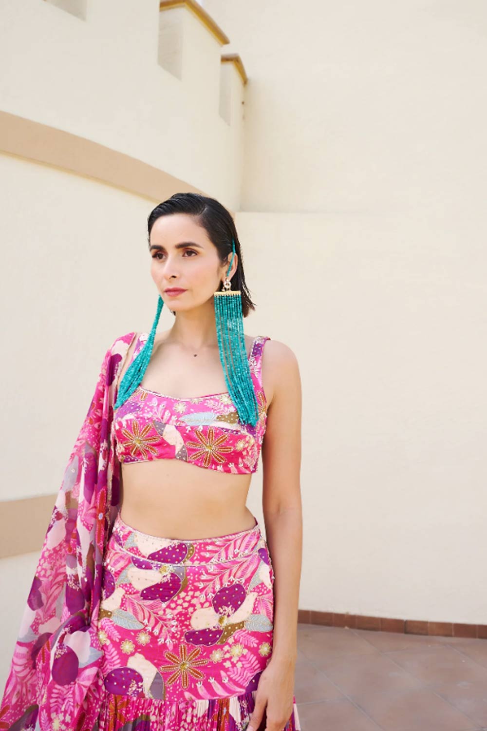 Fuschia Floral Lehenga With Blouse And Dupatta