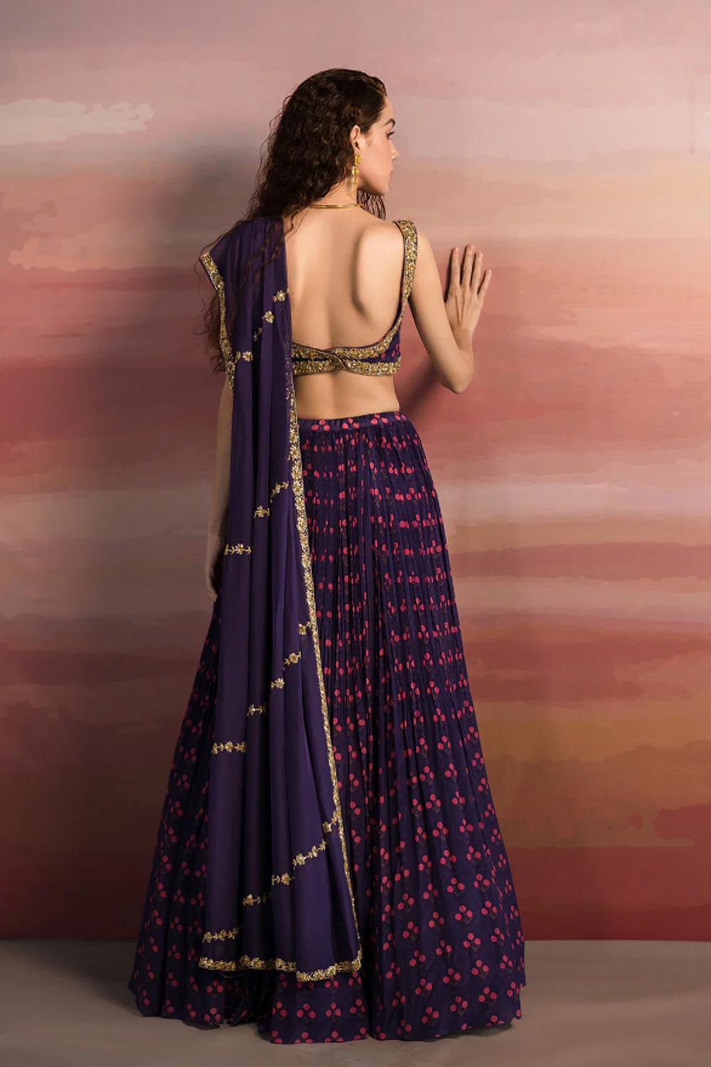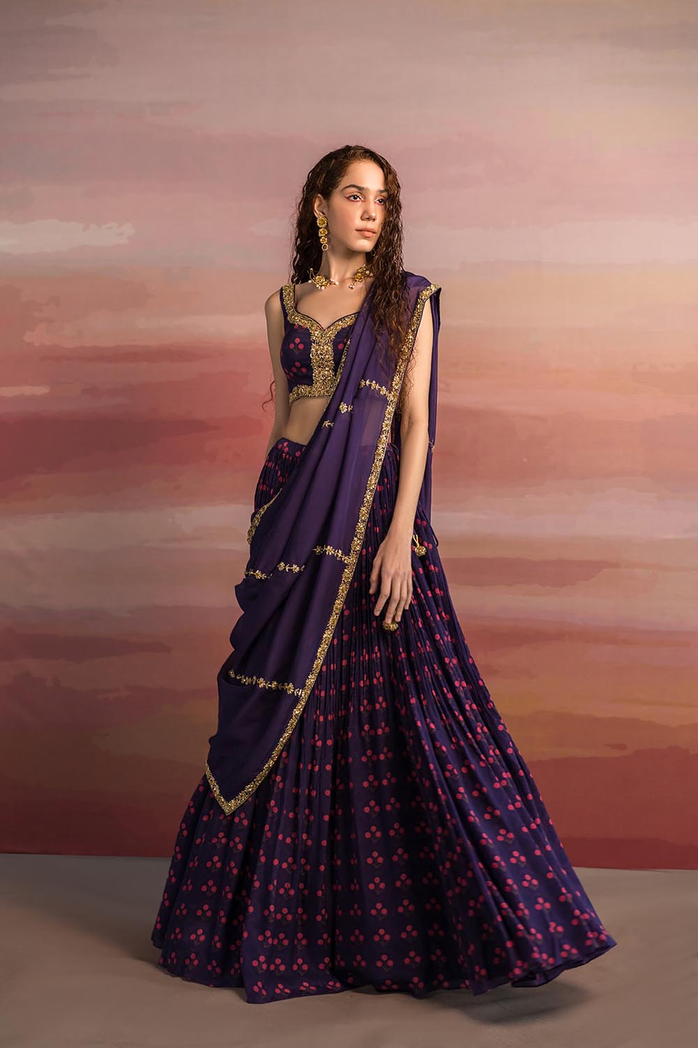 The Purple pleated lehenga in Red flower prints, paired with an embroidered border blouse and diagonal line embroidered dupatta.