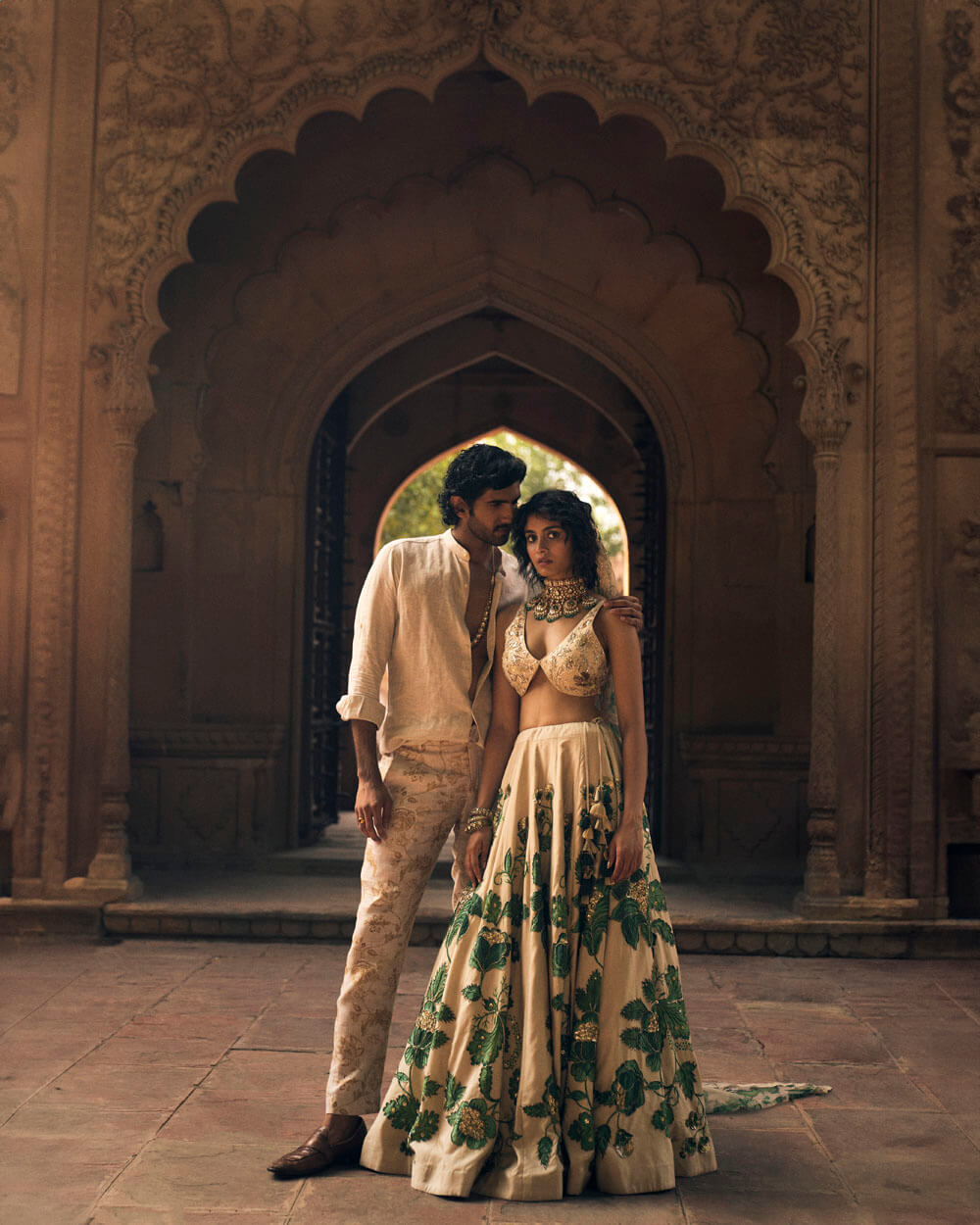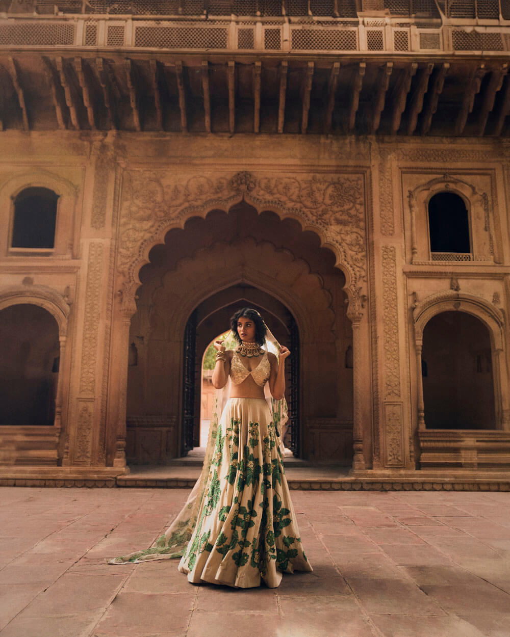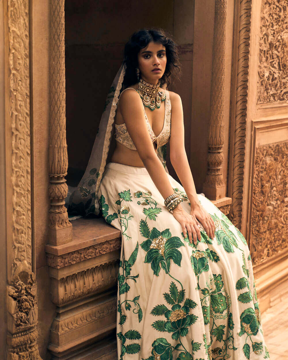 An ivory and green floral print lehenga, featuring intricate hand-embroidery in aari, zardozi and sequins. It is paired with a signature cut printed and hand-embroidered blouse in floral inspired motifs. The look is complete with a delicate floral printed organza dupatta with double scallop embroidered borders.