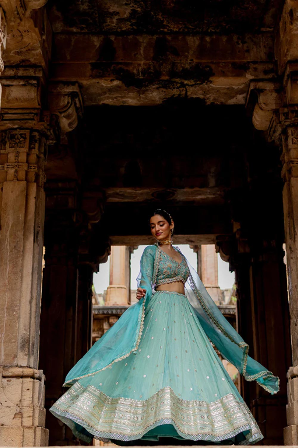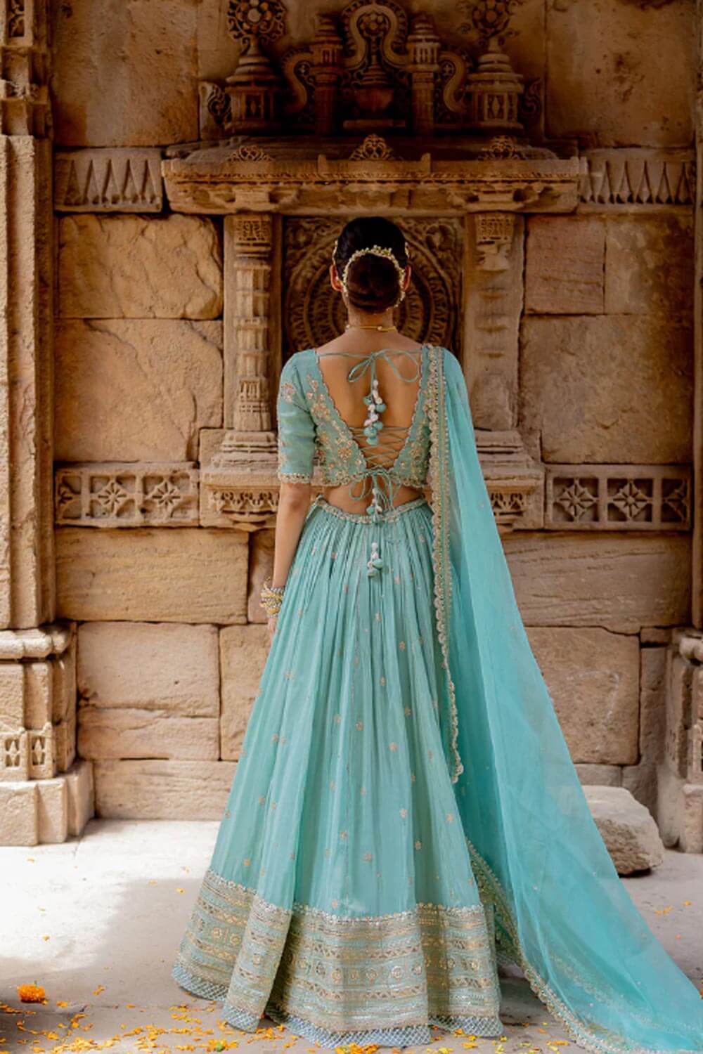 Featuring a sky blue embroidered flared lehenga in zari tissue base with zari, pearls and sequins embroidered thick border. It is paired with a matching hand embroidered blouse in tissue base with deep V-neckline and elbow length sleeves. It comes with a sky blue coloured silk organza dupatta with gota lace border on all sides.