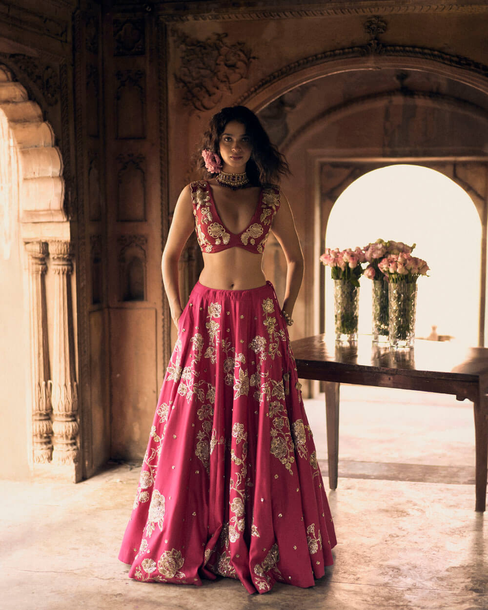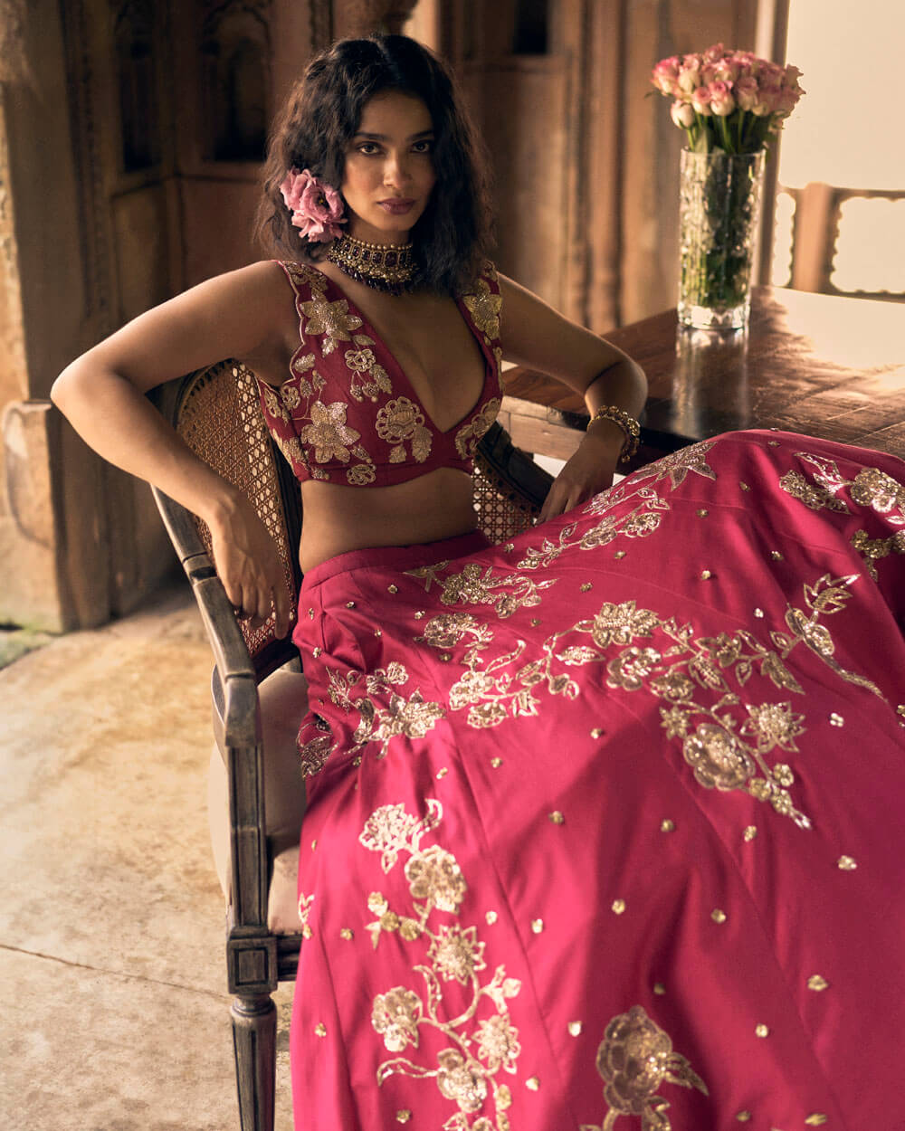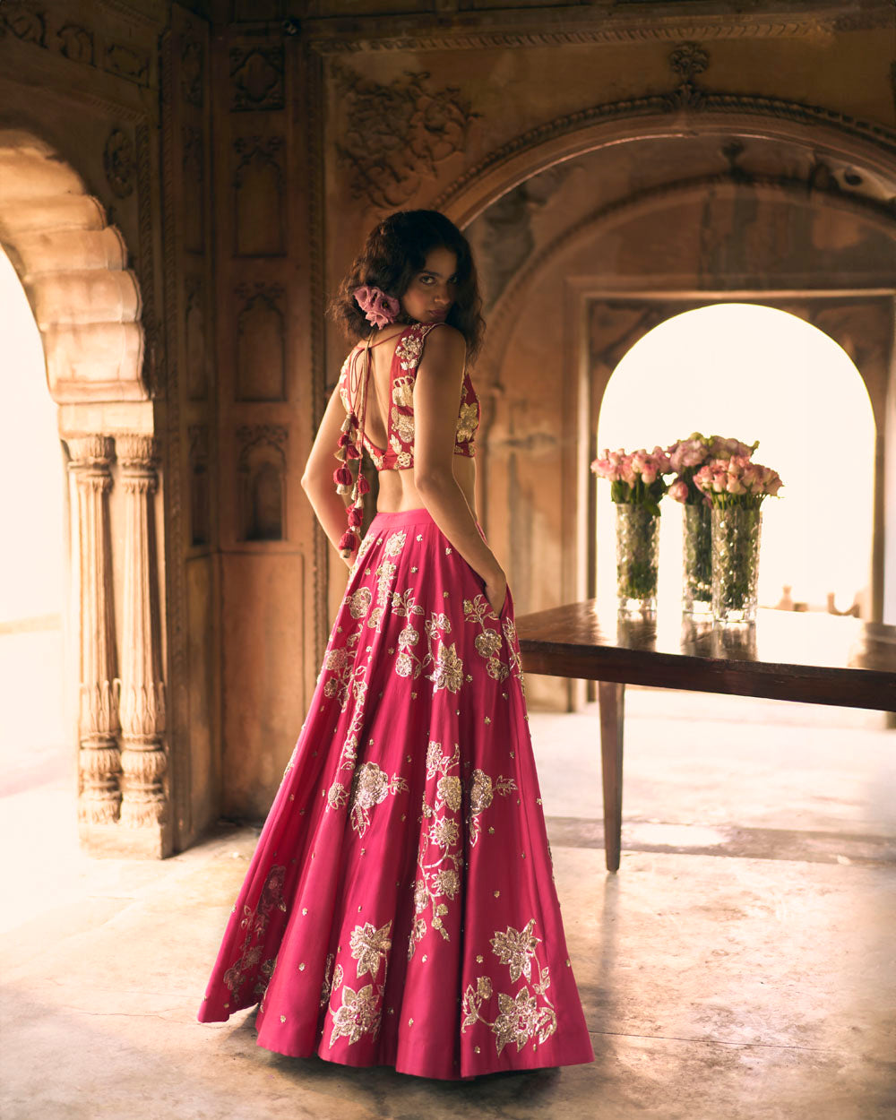 A rani pink lehenga featuring different motif placement on each kali, lending a modern romantic charm. The lehenga and blouse feature intricate hand–embroidery in zardozi, aari and sequins and are complemented with an ombré dupatta.
