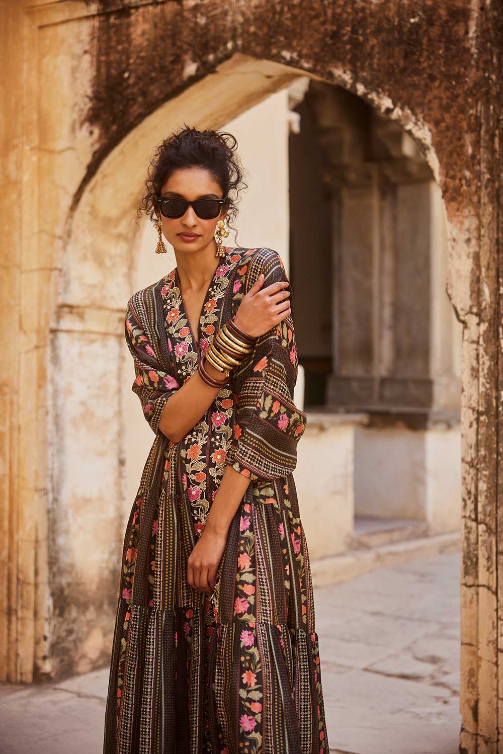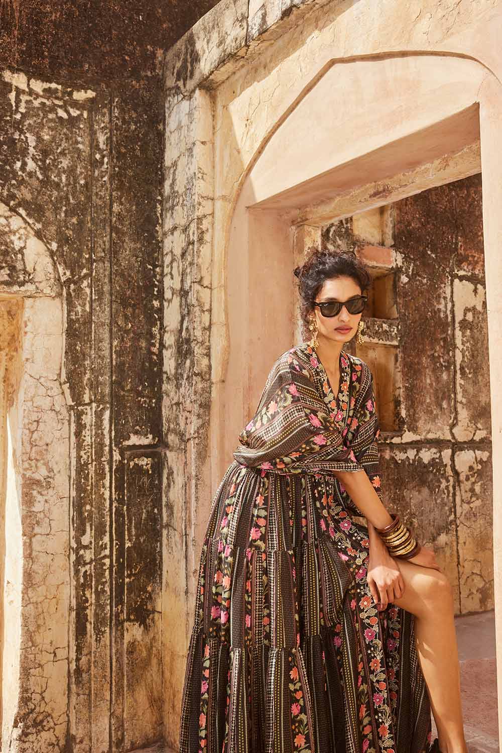 A kaftan set in black pretty florals, perfect for your modern day celebrations. It features statement hand embroidered borders and it is crafted from flowy habutai silk fabric. It is comes with a solid black slip. Style it with classy heels and a pair of gold earrings.
