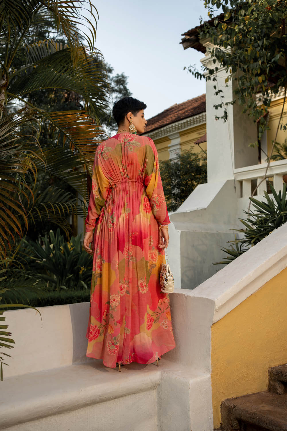 A bohemian inspired creation in a hint of blush. This naksha printed kaftan set is high on style and comfort, the one-size-fits-all silhoutte featuring drawstring tie-ups with tassel detail, sprinkled with mirror, sequins, cutdana and zari, V-cut neck with hand tucked cowrie shell detailing to brought in a bohemian vibe.