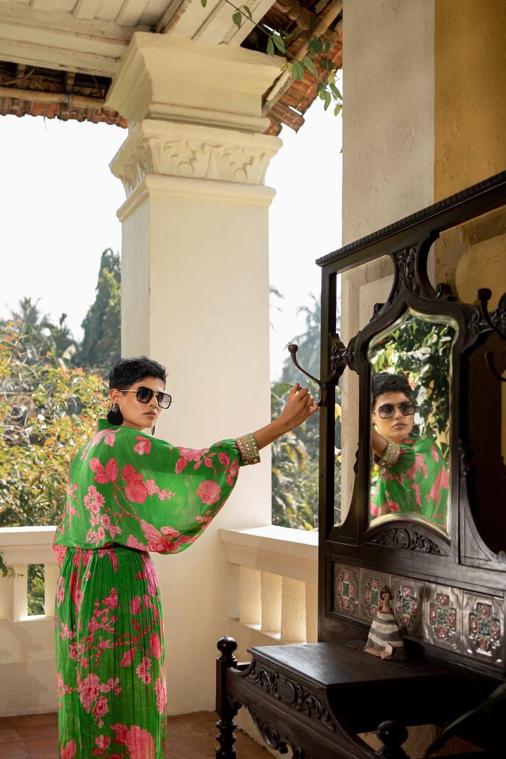 The perfect color printed co-ord set featuring kimono cut cuff sleeve detail, the shirt is a statement piece, cuff is embroidered using sequins, zari, mirror and resham work. It is paired with accordian pleated pants, the set is all you need to stay fashionable for your parties/day function.