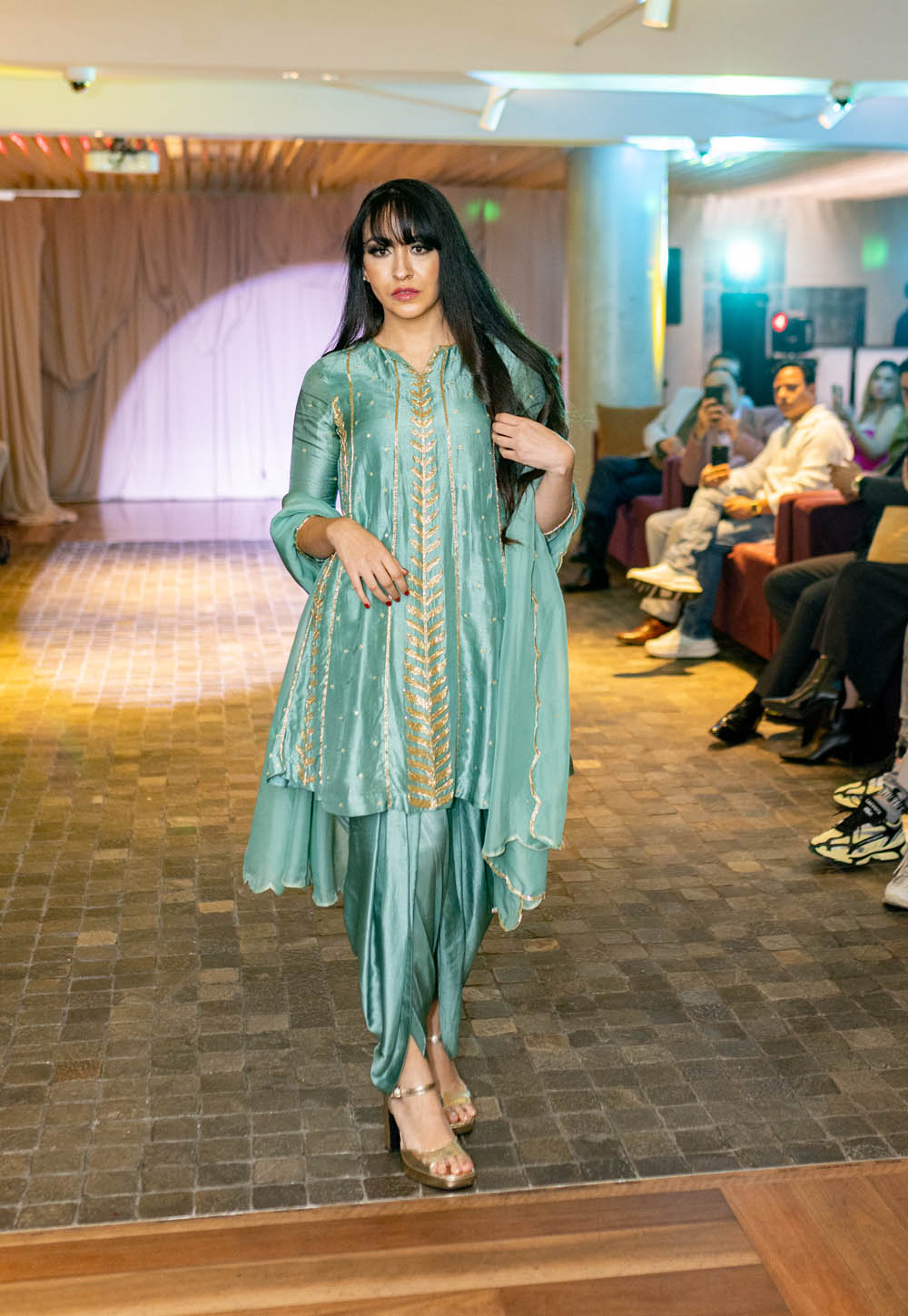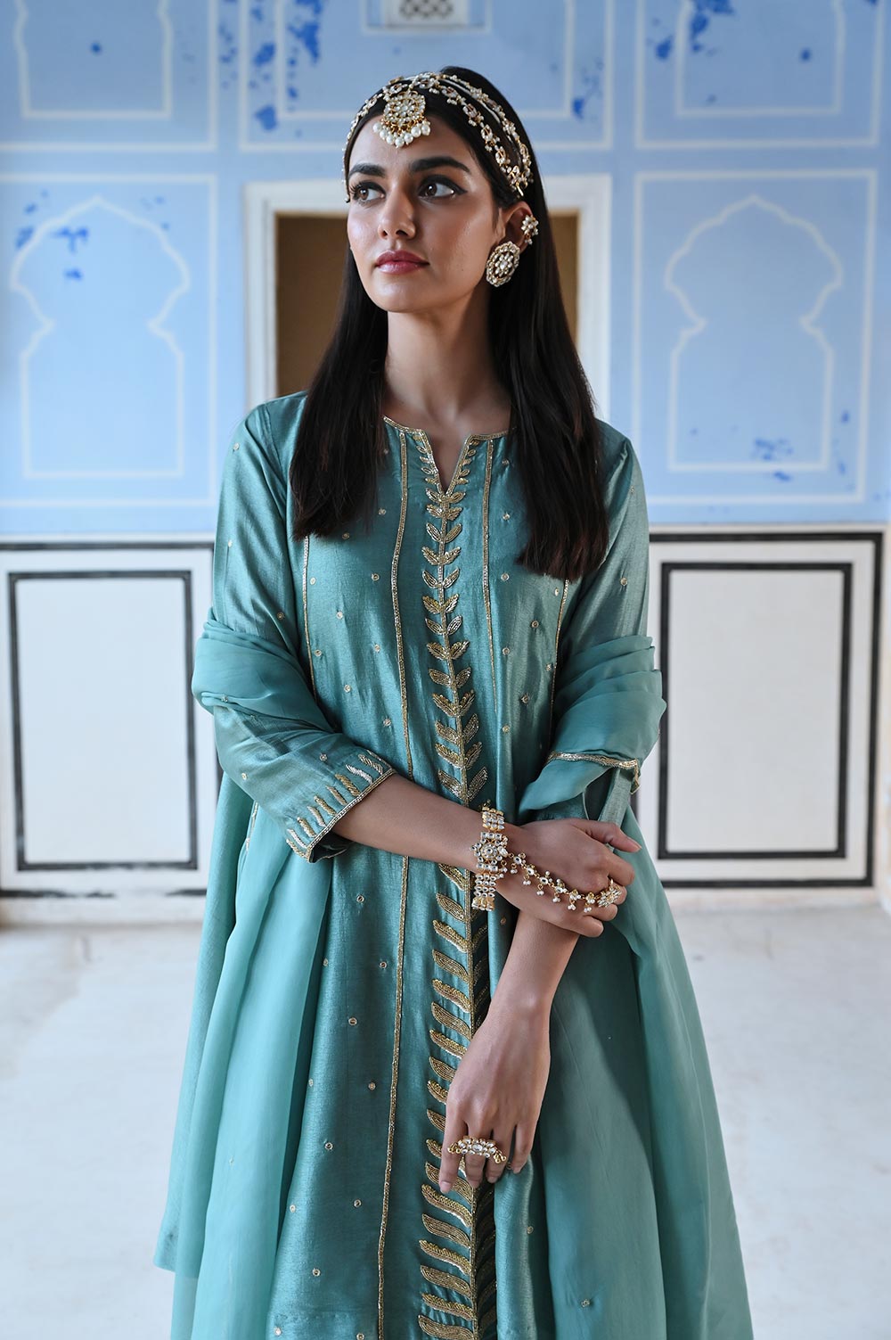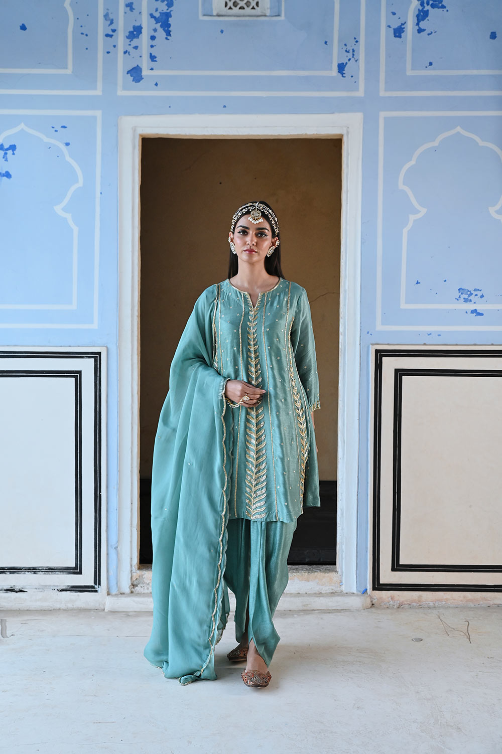 Turquoise Blue 3/4th Sleeve leaf Embroidered Short Kurta with Dhoti and Dupatta.