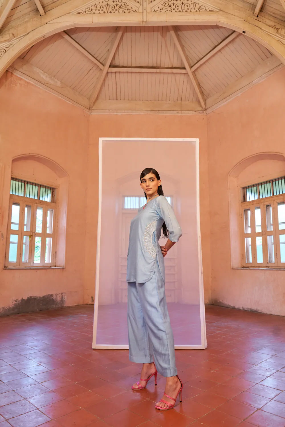 Discover the beauty of understated elegance with our Powder Blue Kurta ensemble. The kurta, adorned with delicate embroidery around the pocket, is a testament to the art of subtlety. Paired with perfectly complementing pants, this ensemble exudes grace and sophistication. Whether it’s a casual day out or a laid-back evening affair, embrace the charm of this timeless combination.