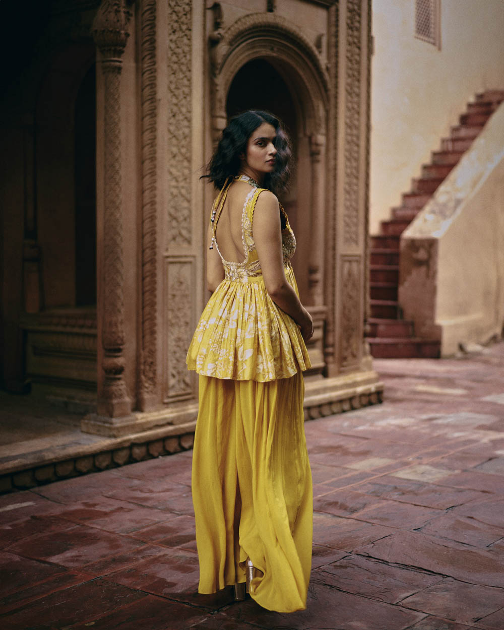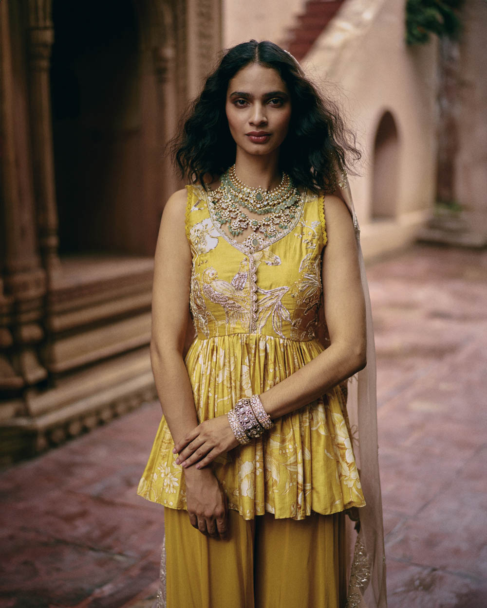 A tuscany yellow peplum set in our signature Roop flip bird print, featuring a pair of birds in their enchanting habitat. It has intricate hand embroidery on the front and back of the yoke, with hand-embroidered lace detailing. It is paired with solid palazzos.