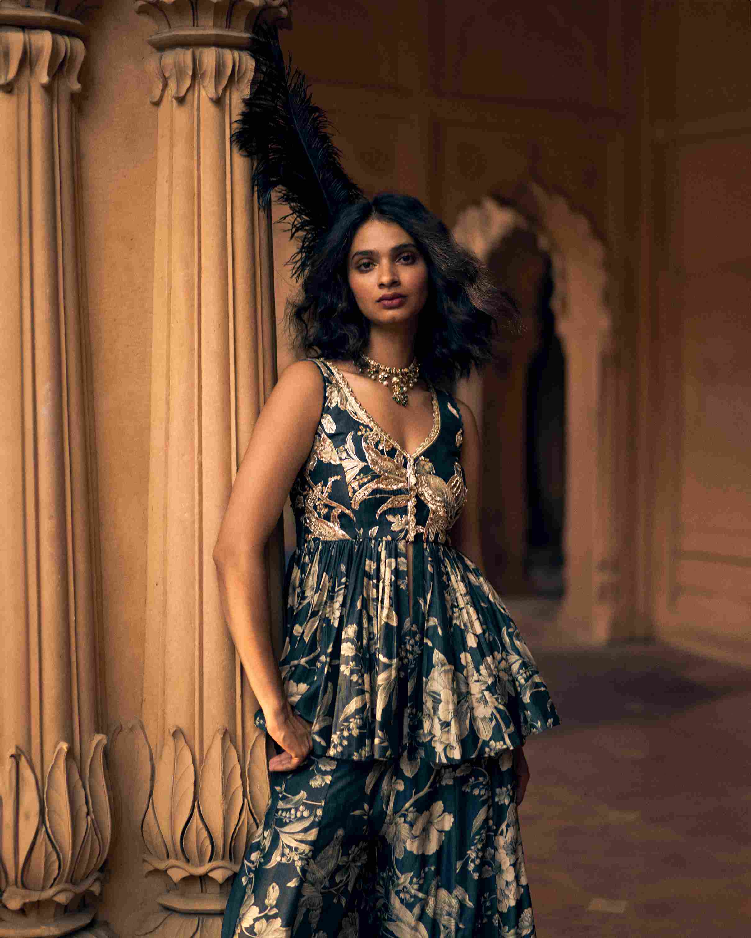 A navy blue peplum set in Paulmi and Harsh signature Roop flip bird print, featuring a pair of birds in their enchanting habitat. The peplum is hand-embroidered with lace on the neckline, and hand-embroidery on the yoke, lending royalty to the breezy silhouette.