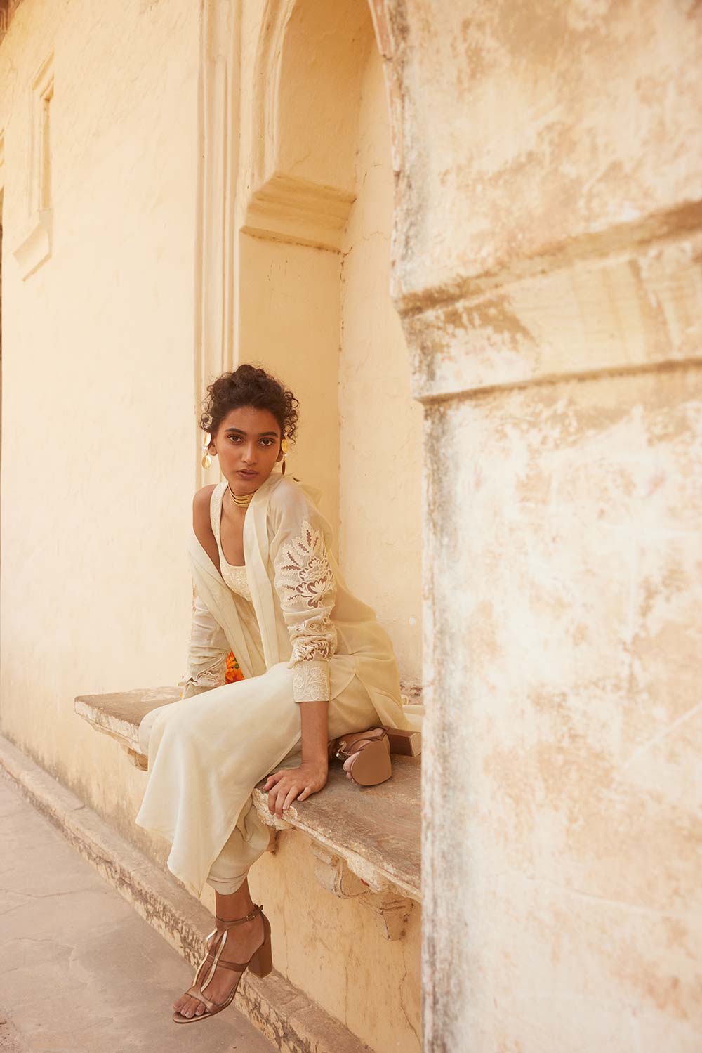 A must have for this season, this elegant jacket set is strewn with beautiful florals on the blouse and jacket, in delicate cutwork embroidery.