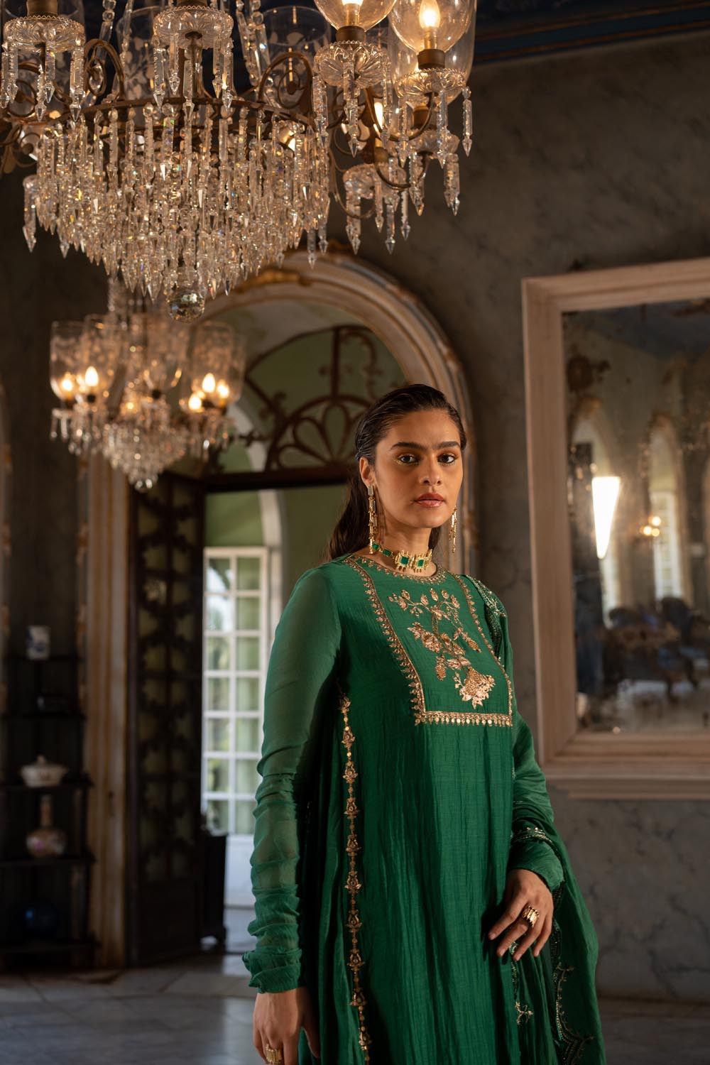Featuring an emerald green malai chanderi kurta pant set paired with a scallop detailed dupatta. Yoke is highlighted with anar motifs using antique gold handwork.