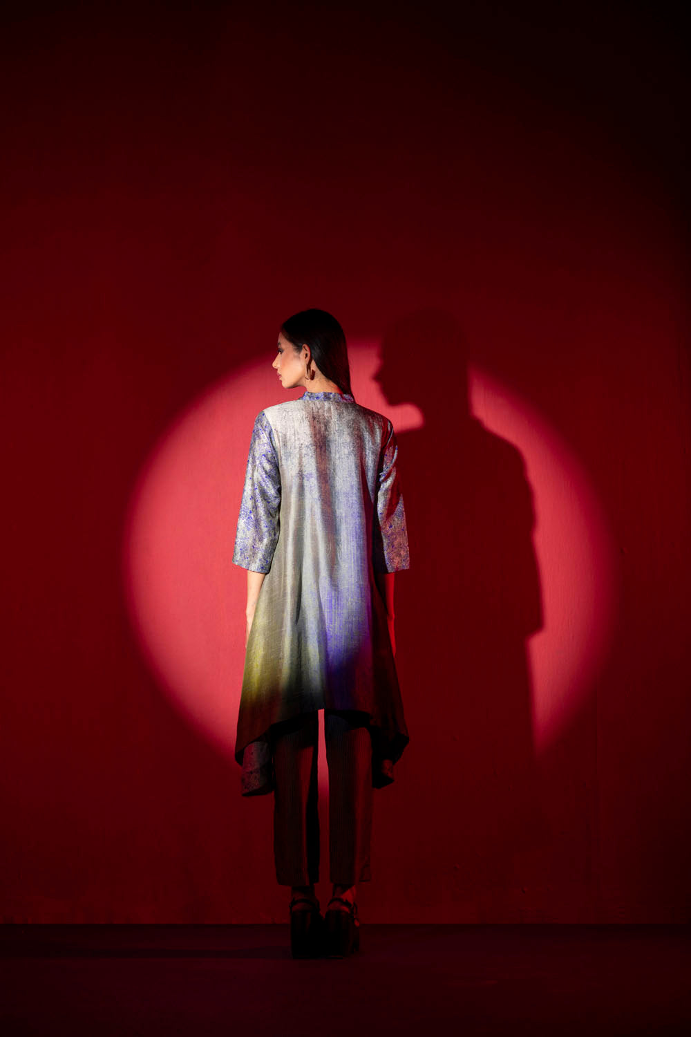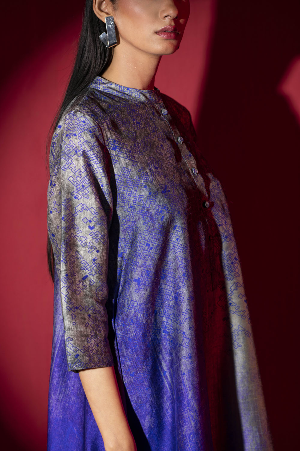 Grandeur silhouette in contemporary print designed in house has tails and is complimented with mandarin collar and 3/4th sleeves.
