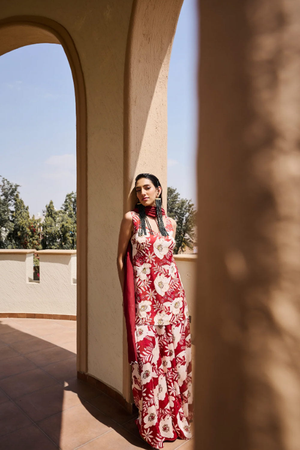 Maroon- White V-Neck sleeveless Floral Print Embroidered short kurta with Kalidar Palazzo and All over Chitta, Scallop Embroidered Dupatta