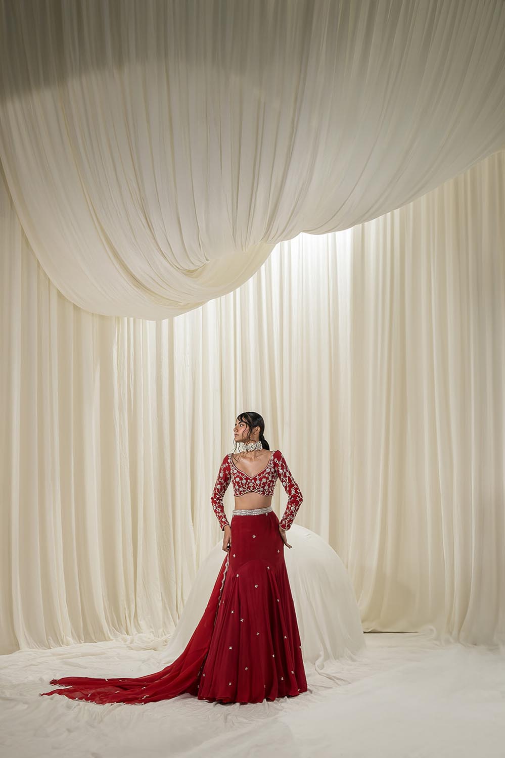 Featuring an intricate fit and flare lehenga in maroon hue paired with a heavy jaal embroidered blouse and all over butta embroidered scallop dupatta.