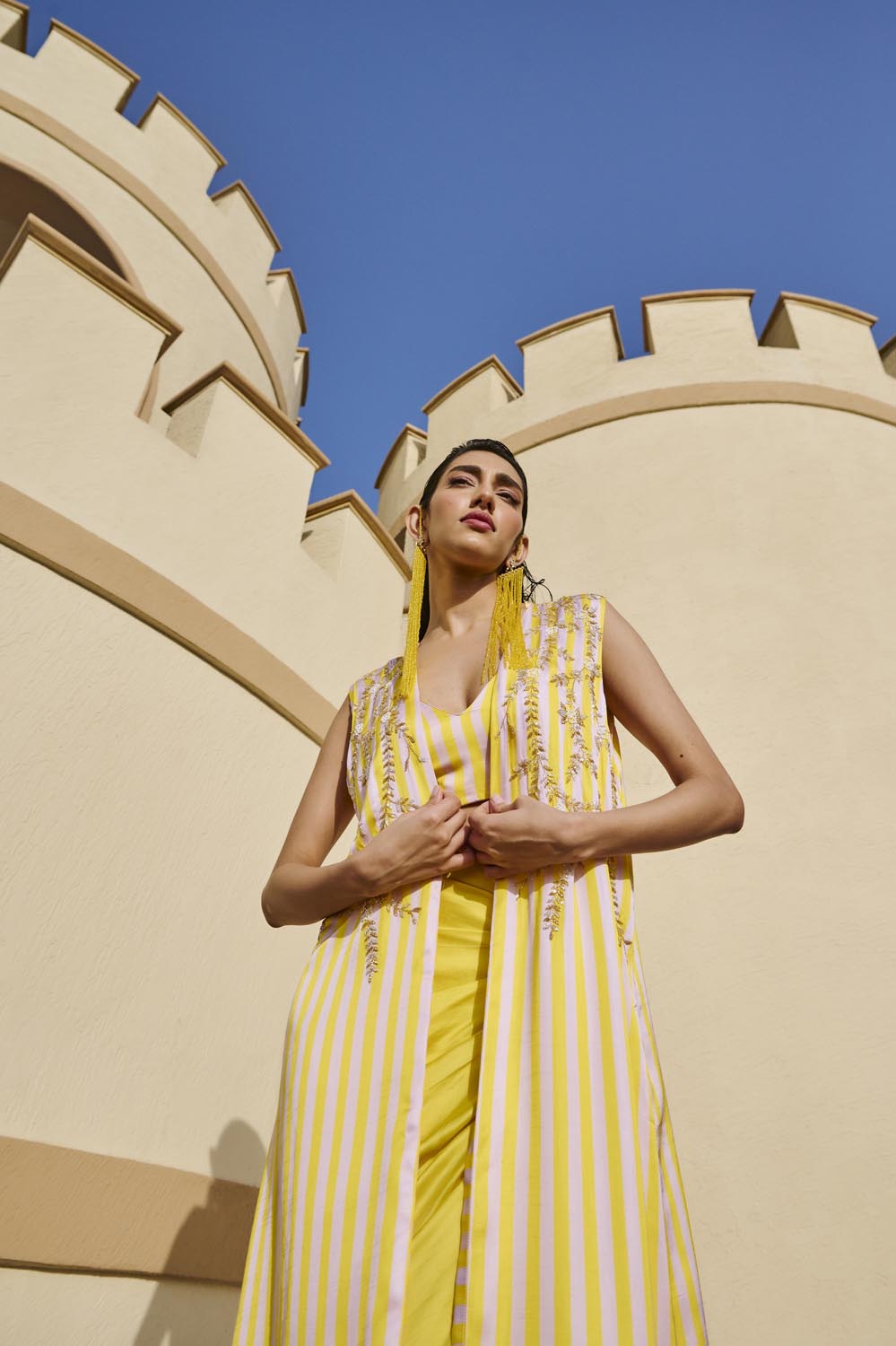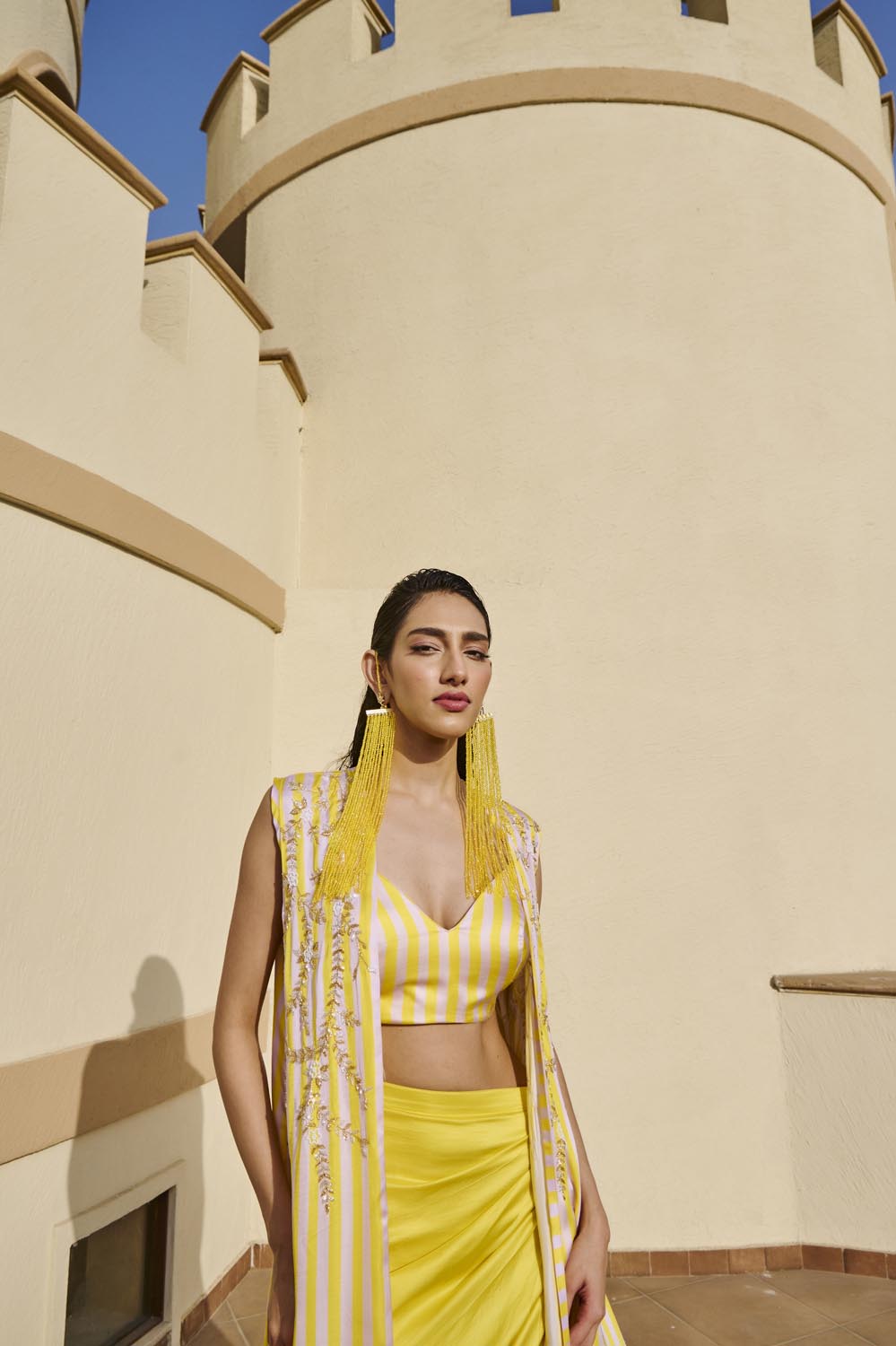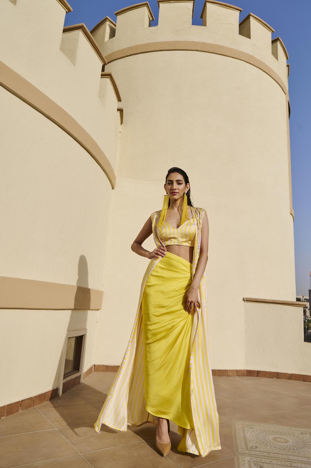 Yellow striped printed jacket with embroidery on the shoulder paired with raw satin striped bustier and draped skirt.