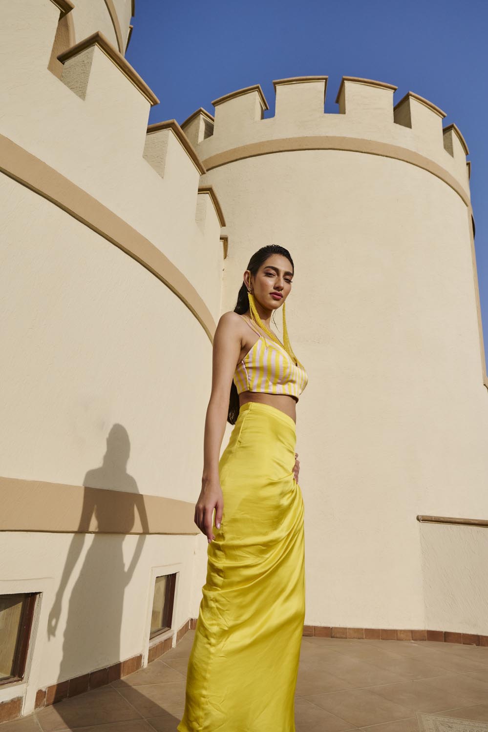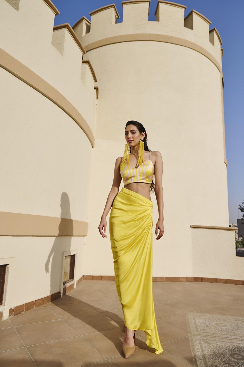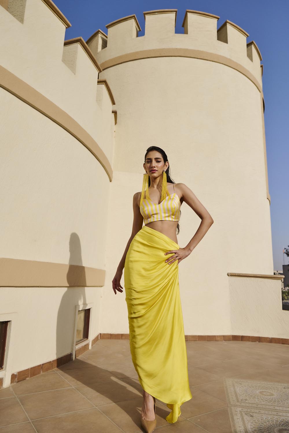 Yellow Striped Jacket With Draped Skirt And Bralette