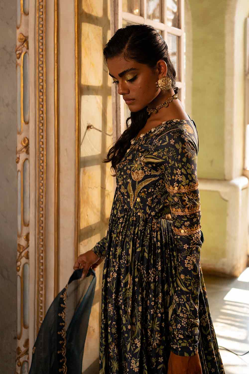 Featuring a navy blue anarkali set in our signature wildflower print with tissue base paired with a highlighted scallop dupatta. The anarkali is highlighted using boho kowri shells and antique tone sequins.