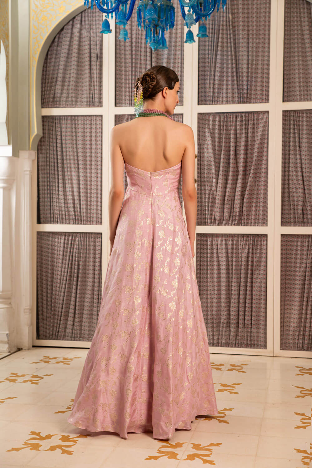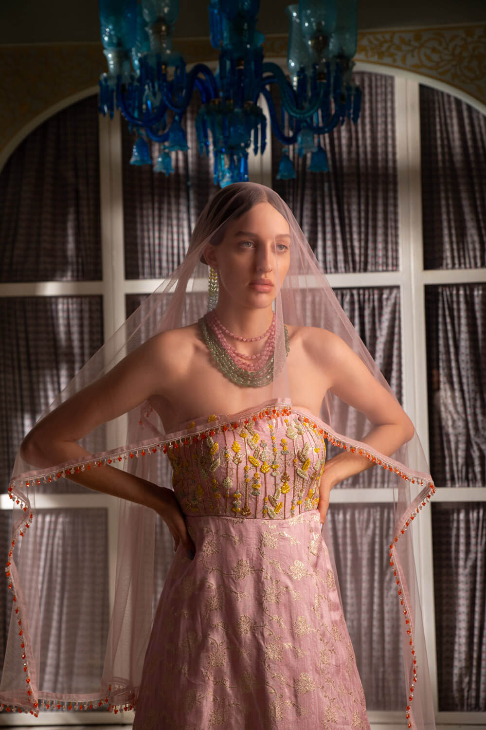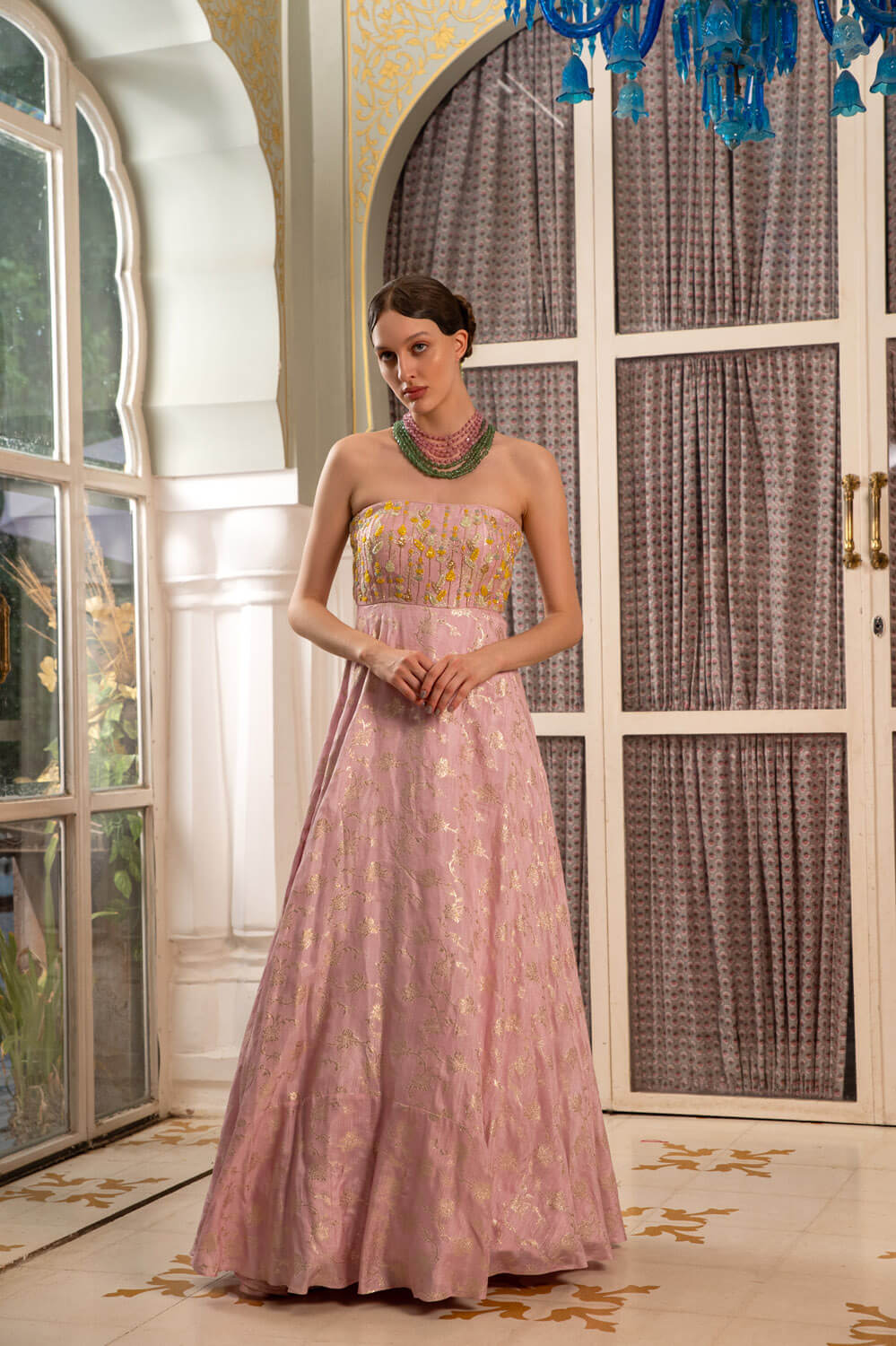 Top: Onion Pink Woven Banarasi Zari Strapless Anarkali with Hand Embriodered Floral Lines.