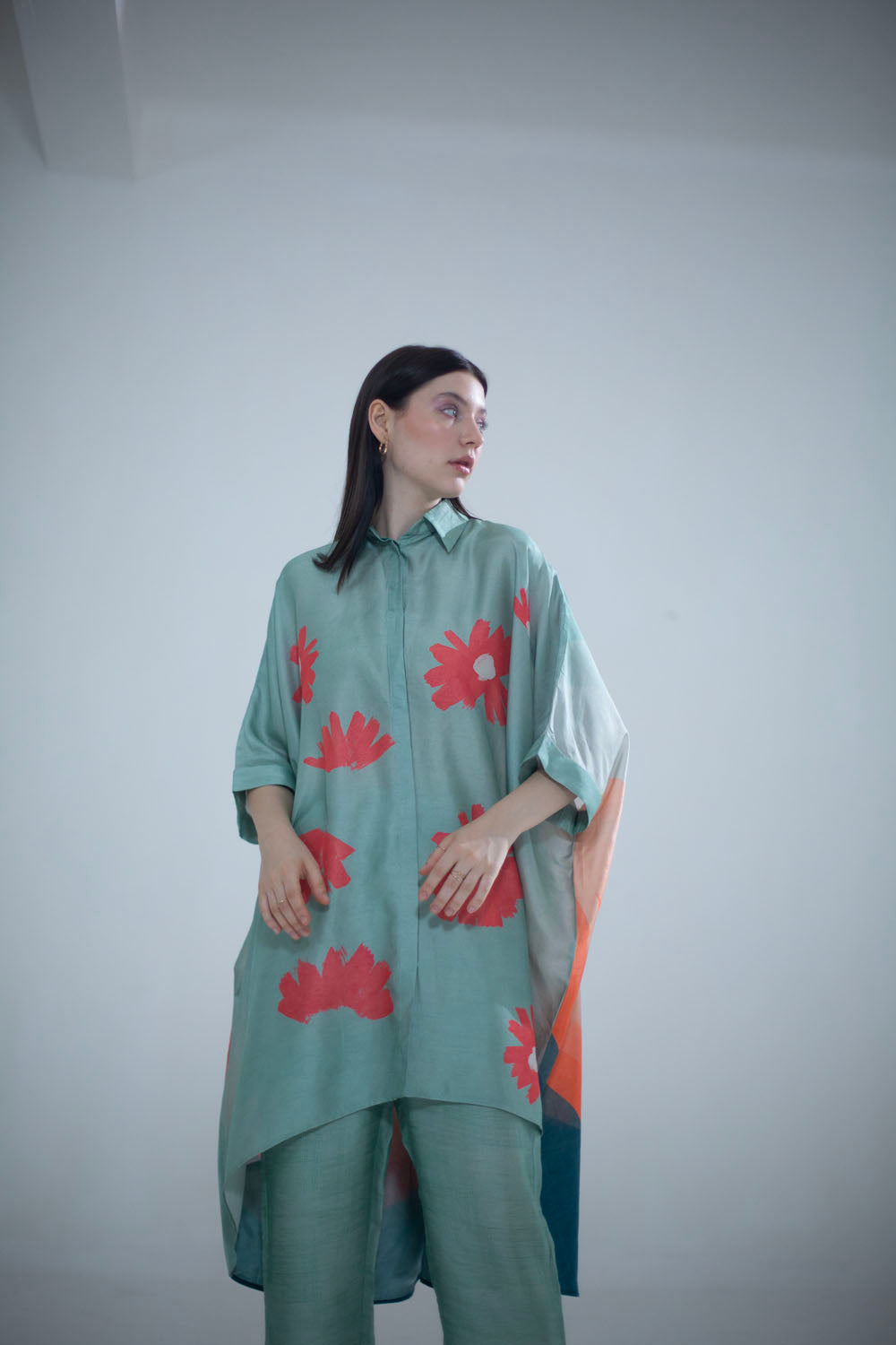 A two piece dupion silk set comprised of abstract geometric and floral print in playful color compositions and parallel pants with fusion textiles.