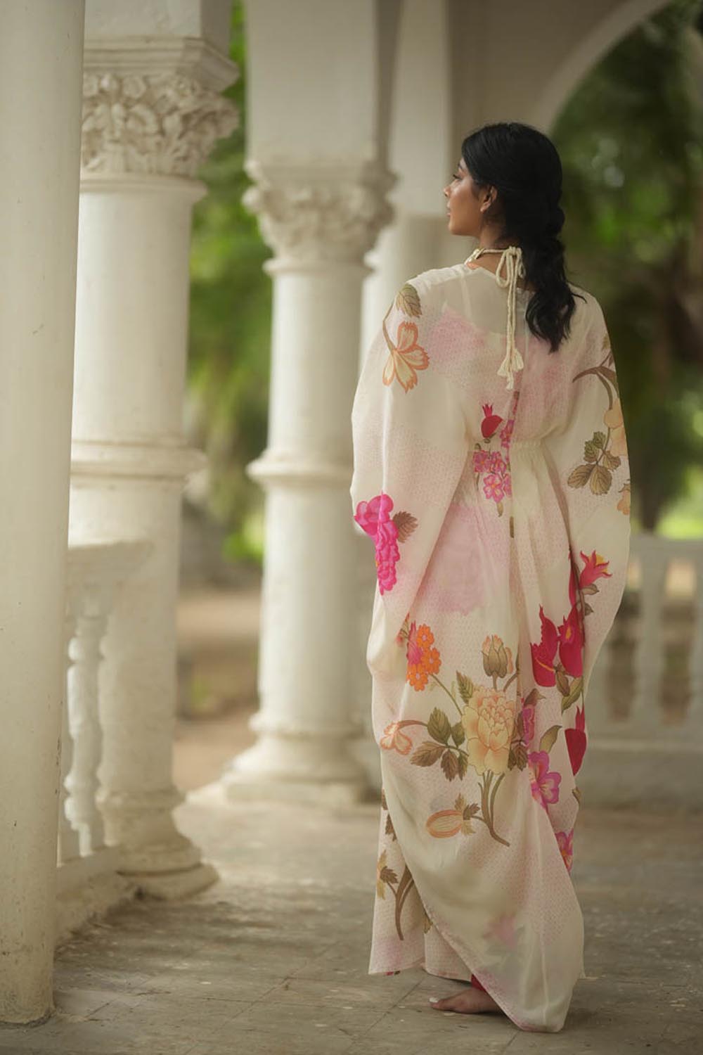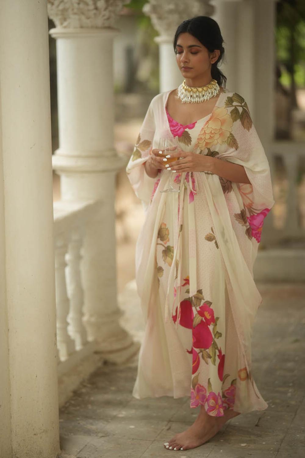Off–white placement anar print maxi dress, paired with a draped jacket with a tie up in the front. Perfect for a sundowner or for languid days by the pool.