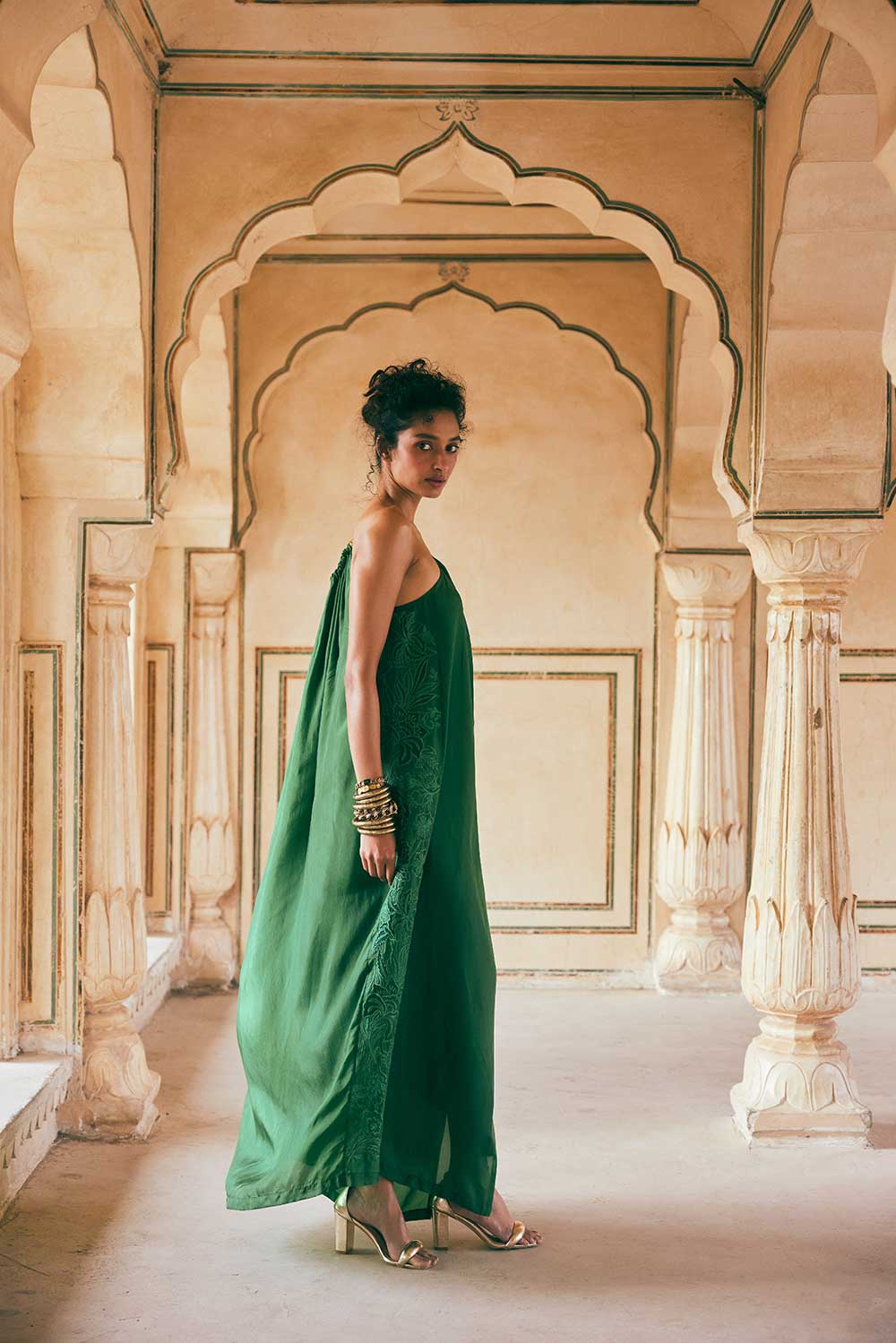 The emerald green one shoulder chain dress is cut from a luxurious pure habutai silk fabric. The dress has cutwork technique side panel with our signature floral jaal,it has a side slit. The silhouette is relaxed and has breezy feel.