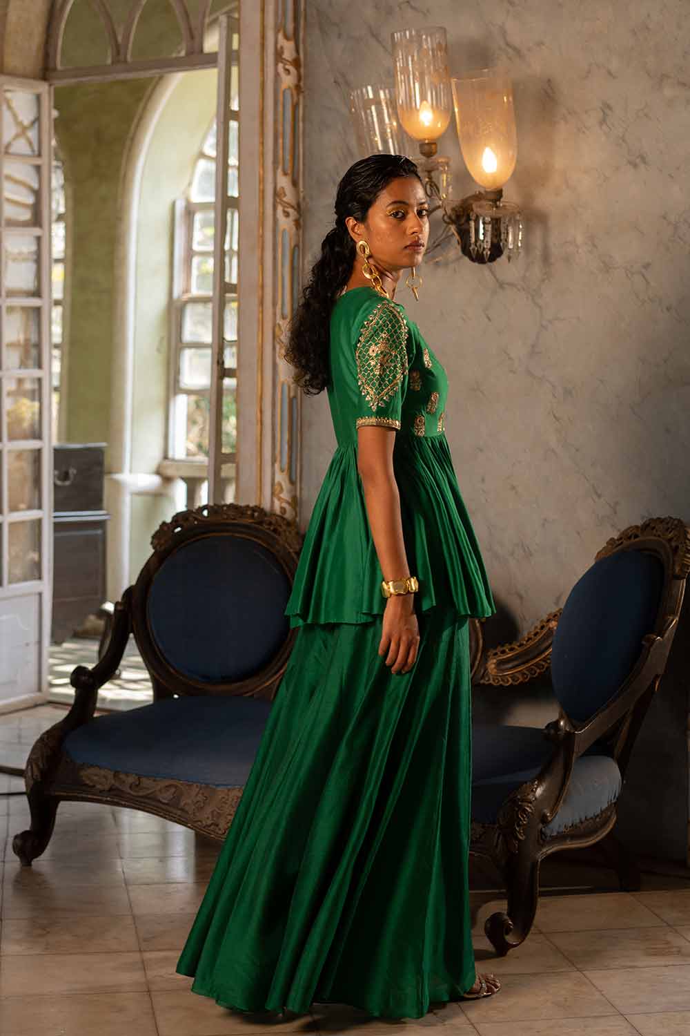 Featuring an emerald green chiniya silk peplum set paired with cotton silk base palazzo with antique tone gold sequins and zari embroidery.