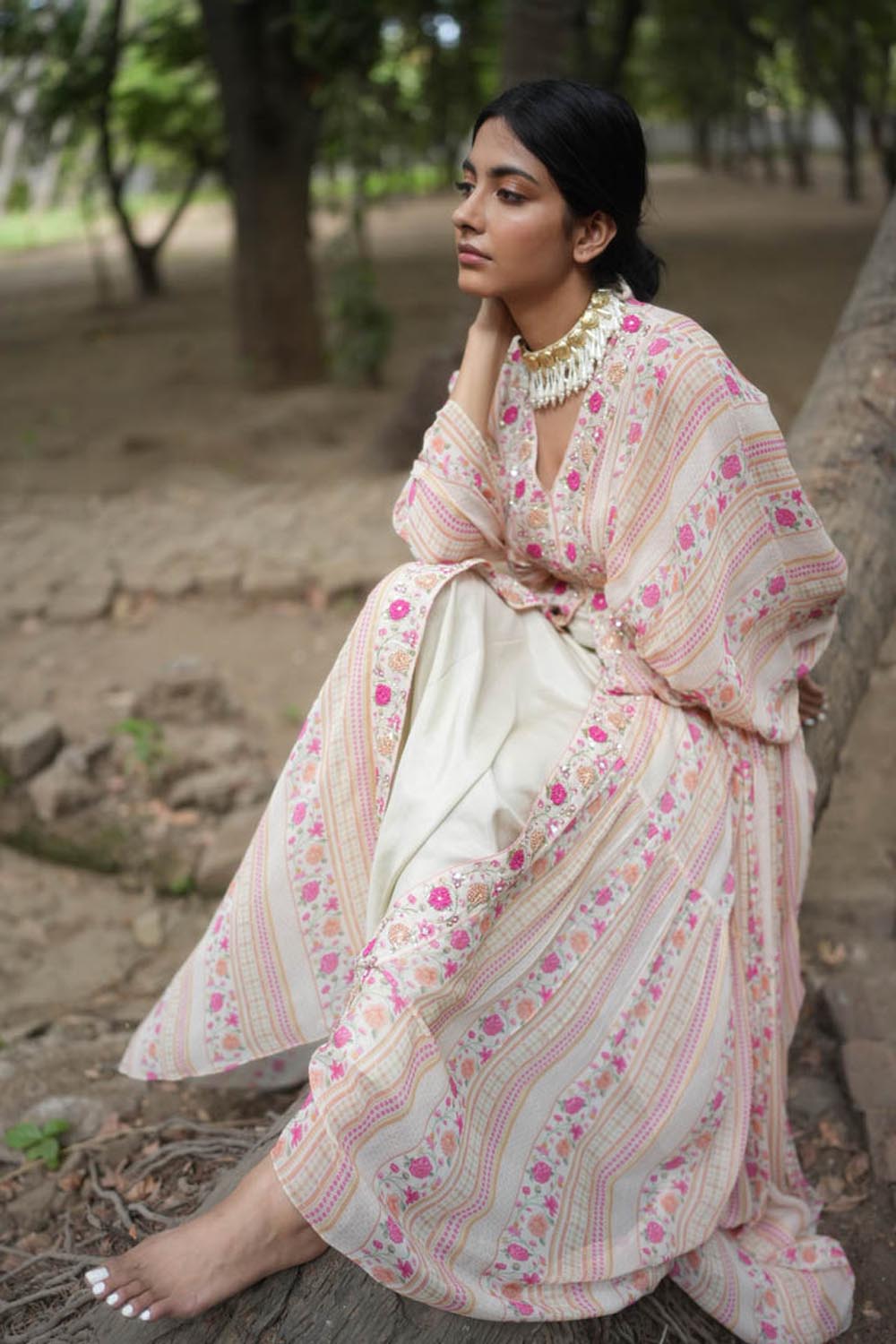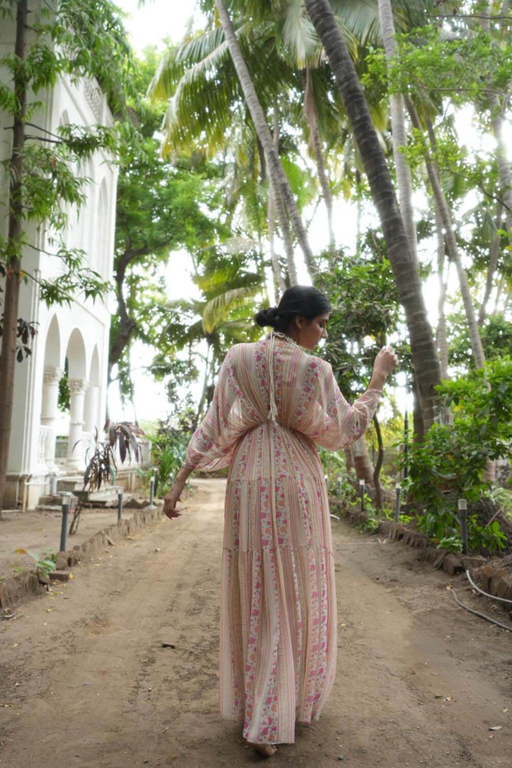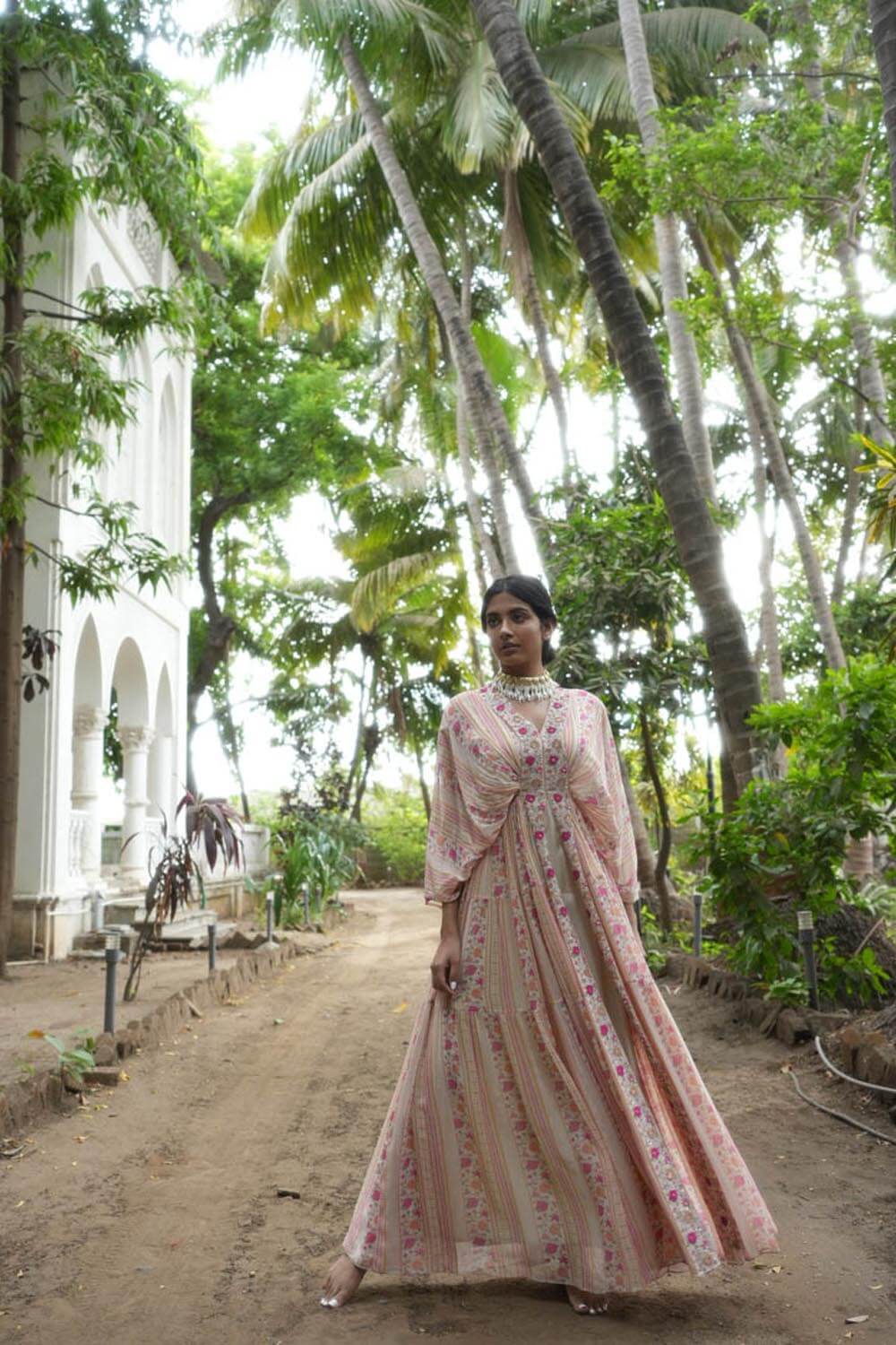 A gorgeous rose border print kaftan is highlighted with moti, mirror and cutdana is an easy pick for a beach wedding.