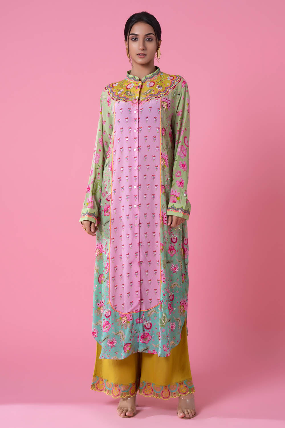 Yellow Yoke Floral Print, Turquoise Ombre, Baby Pink Color Sb Signature Embellished Shirt Dress With Green Embroidered Pants.