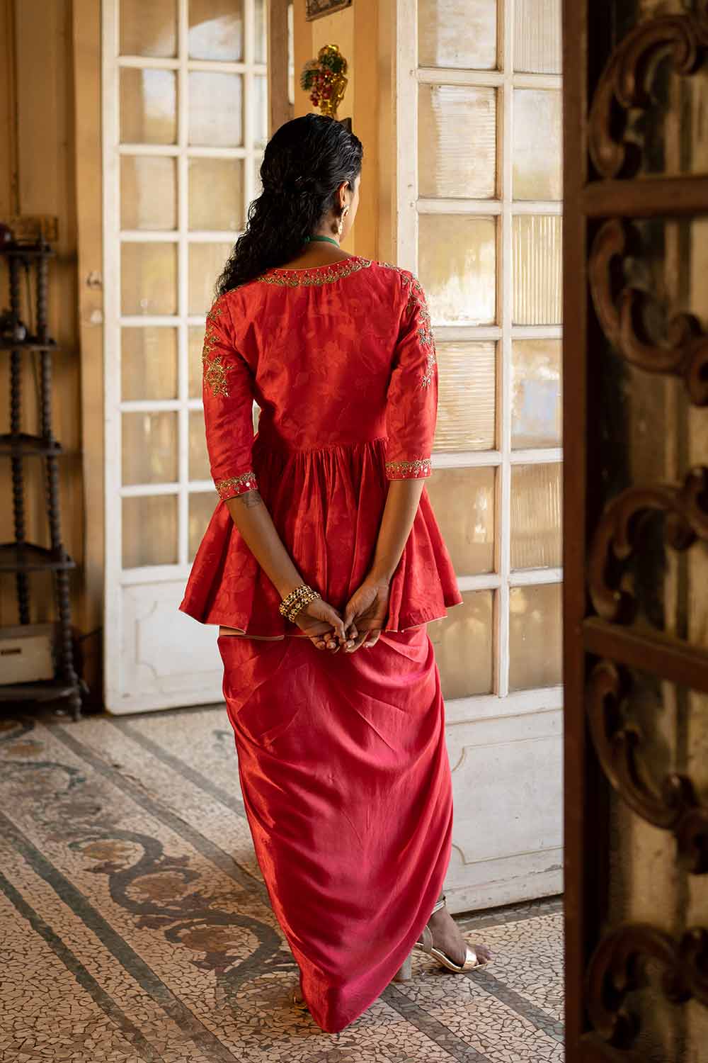 Sunheri Russian Jacquard Peplum Set With Draped Skirt
